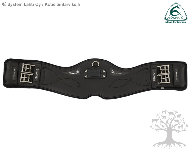 Acavallo Dressage Girth Comfort Gel. The Acavallo comfort girths are completely made of composite material (TPU) and eco-leather, and equipped with the new Acavallo Gel Padding System. The special design of this gel panel eliminates the risk of pinching and relieves pressure on the sensitive internal organs of your horse, also allowing an increased blood circulation and supply of oxygen. The arrangement of the individual gel padding elements has been developed to facilitate breathing and reduce transpiration by means of a sophisticated airflow pattern, preventing excessive heat accumulation even under high-performance conditions.