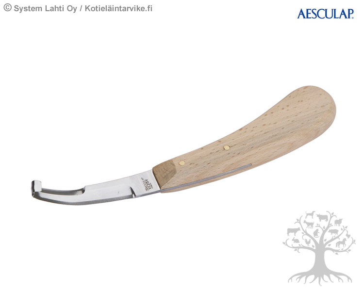 Aesculap Hoof and claw knife Double-edged, Narrow. Hardwood handle ergonomically shaped for fatigue-free working and stainless steel blade of the highest quality for best durability and re-grinding properties.2-stage grinding for maximum precision. For veterinarians, hoof trimmers and farmers.