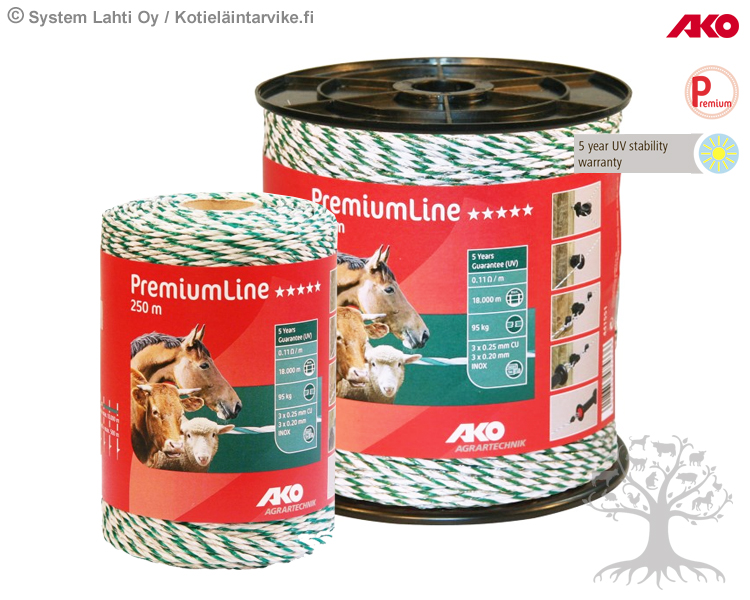 AKO Poly Wire PremiumLine. AKO PremiumLine Wire guarantees maximum conductivity and herding safety, even for the longest of fences. 5 year UV stability warranty.
