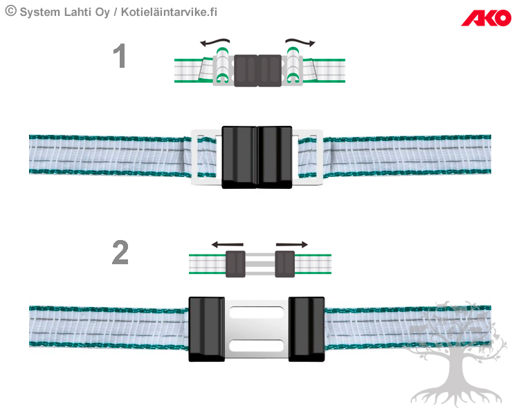 Ako Tape Connectors Litzclip. Easy connection of 2 tape ends. Special narrow, punched rectangular openings for the easy introduction and securing of the tape. Material stainless steel. No tools required for mounting. Continuous electrification. Made in Germany. Patented. Pack size: 5pcs.
