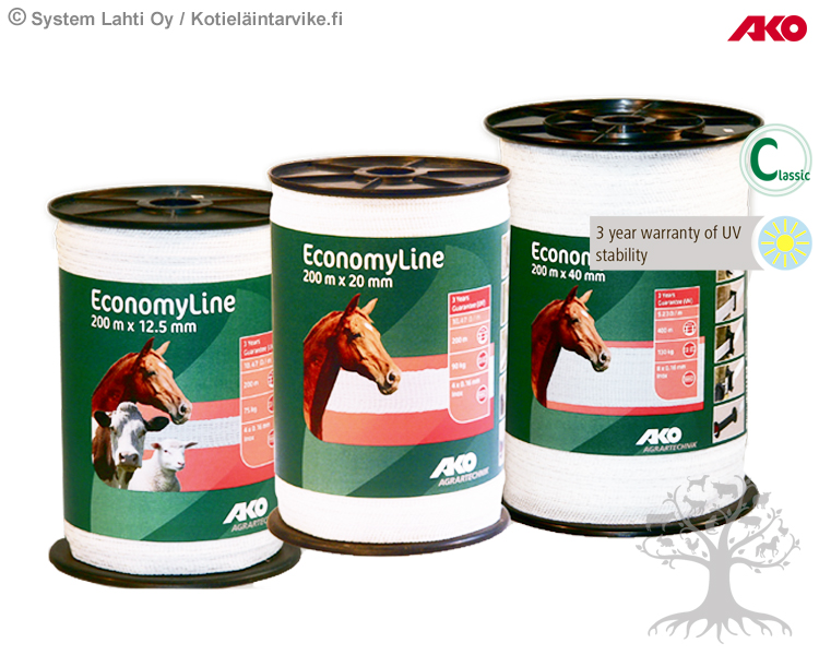 AKO Tape EconomyLine. Affordable electrically conductive fence tape for short fence lines. Standard fence tapes for short fence lines and strip grazing areas. 3 year warranty of UV stability.