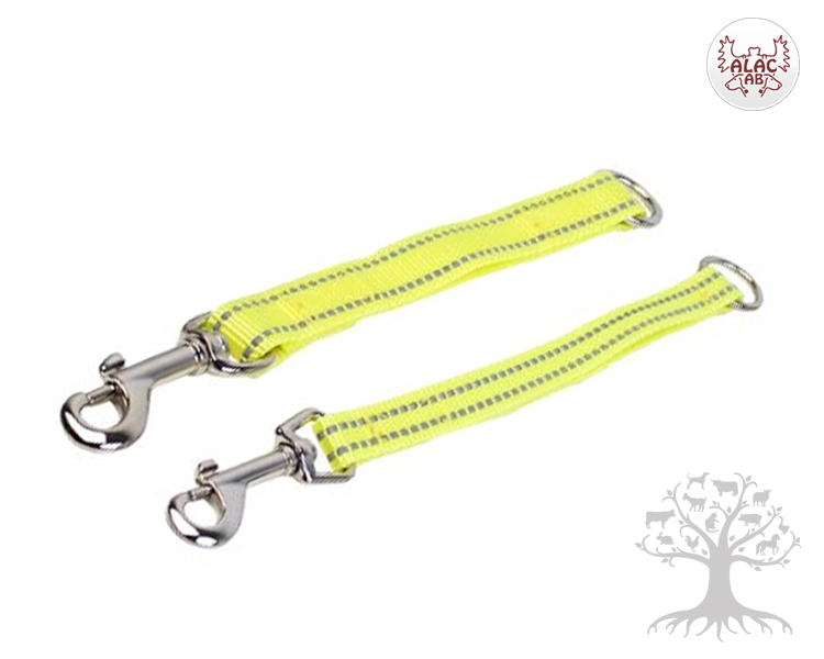 Alac Taluttimen Heijastinjatke, 20cm. Nailoninen heijastinjatke kaulapannan ja taluttimen välillä käytettäväksi. Nailoniseen taluttimenjatkeeseen on ommeltu hyvin pimeässä näkyvät heijastinompeleet. Heijastinjatke on väriltään neonkeltainen, joka erottuu hyvin hämärällä. Heijastin taluttimessa lähellä koiraa on hyvällä näkyvällä paikalla, joten esim. autoilija huomaa hyvin myös talutettavan koiran. Heijastin voidaan kiinnittää ja käyttää monella tavalla. Heijastinjatkeen toisessa päässä on metallinen pistoolilukko ja toisessa päässä O-rengas. Heijastinjatke on 20 cm pitkä. Heijastinjatketta on saatavilla kahdella eri leveydellä.