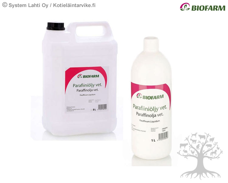 Biofarm Paraffin Oil Vet. Paraffin oil is used as directed by a veterinarian for horse colic, bloat in cattle, and temporary constipation in dogs and cats. Not for continuous use. The product is also suitable for oiling wood products. Paraffin oil is odorless, tasteless and colorless. Pack size: 1L and 5L.