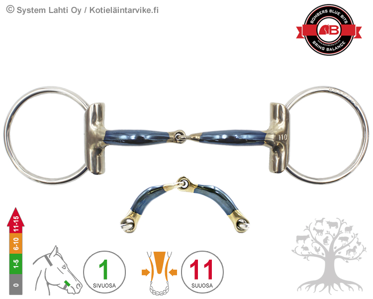 Bombers Eggbutt Loose Ring Snaffle. Bombers Snaffle is a popular bit due to the curved mouthpiece which distributes pressure more evenly over tongue and bars and reduces the nutcracker action. The offset center link avoids the usual pressure point on the tongue. The nutcracker action results in the horse lifting its head, therefore offers a solution for the horse that runs with its head down. The mouthpiece can be optionally more curved, creating a more comfortable bend than the conventional, which reduces pinch and spreads pressure points around the bars.