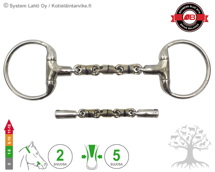 Bombers Eggbutt Waterford Barrel. The Waterford Barrel has a few smooth flexible cylindrical components which spread the pressure points making it a light mouthpiece. The mouth piece curves around the tongue applying even tongue and less bar pressure. The greater flexibility discourages a horse from leaning on it, it also promotes mouthing and salivation. Bomber recommends this for horses with tongue sensitive fussy mouths.
