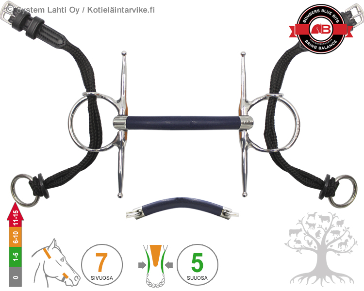 Bombers Full Cheek Gag Bomber Blue Mullen. The Mullen distributes pressure evenly over all the structures of the mouth, while this avoids pressure points, it does make the Mullen a fairly strong bit. The material used allows the bit to remain light and it encourages salivation. It is particularly well suited to horses that object to metal mouth pieces.