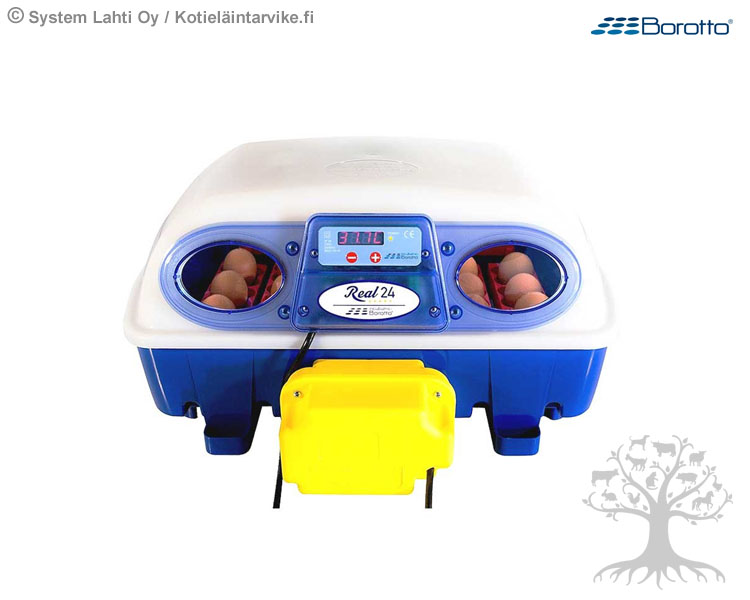Borotto Incubator REAL 24 Automatic. The incubator is suitable for hatching eggs for eample fromhen, pheasant, guinea fowl, quail, partridge, duck, mallard, goose, turkey, peacock. Capacity 24 eggs placed in the cell device or 96 small-sized eggs (such as quail eggs). Egg trays can fit either small (quail) or large (duck) eggs in the same racks without having to change anything over. The first professional egg tray in the world capable of holding any type of egg vertically, from goose eggs to quail eggs. The vertical position of the eggs during incubation is the same used in the latest generation of industrial incubators. It always guarantees significantly higher hatching percentages compared with horizontally incubated eggs in old incubators, now technologically obsolete. The internal basins can be filled up by pouring water in the handy fillers outside the incubator. The external operations are fast and practical, drastically cut down the humidity loss that would otherwise be wasted by opening the incubator to fill up the internal basins. REAL 24 automatically turns the incubated eggs for the entire incubation period. The eggs are tilted from right to left (and vice versa). A full cycle lasts 1 hour, following the same process used in industrial incubators. Three days before hatching, the turning motor must be turned off.Thanks to 2 large inspection windows on the incubator lid, which ensure full and constant internal visibility, without ever having to open the incubator during incubation or hatching.