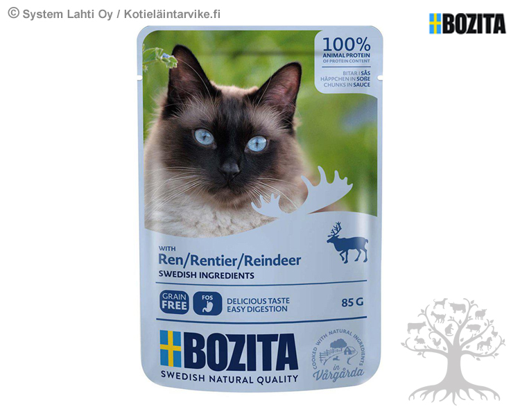 Bozita Wet Food With Reindeer Chunks In Sauce 85g. Bozita chunks in sauce with reindeer in a handy single portion pack. The reindeer meat comes from the fells of Lapland, where the reindeer graze freely in the fell landscape and have been guarded by the Sami since ancient times.