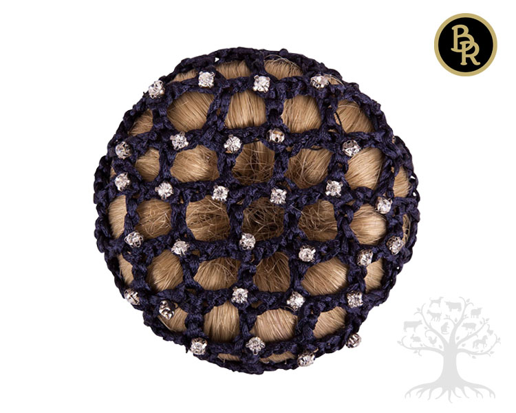 BR Hiusverkko Big With Diamonds Blue. Erittäin laadukas ja ylellisen tyylikäs musta hiusverkko koristestrasseilla. Hiusverkkoon mahtuu hyvin iso pyöreä hiusnuttura. Harva ja paksuhko verkko nutturassa on näyttävä!