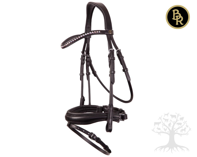 BR Koulusuitset Southam Black. BR laadukkaat ja kauniit pyöröommellut koulusuitset erikoisleveällä turpahihnalla. Suitsien turpahihna on noin 4,5 cm leveä. Turpa- ja niskahihnassa on todella pehmeät toppaukset. Niskahihnassa E-Line muotoilu, jonka ansiosta niskahihnaan kohdistuva paine pääsee jakautumaan tasaisesti hevosen korvien takana olevien herkkien hermojen kohdalla. Turpahihnassa on pullback kiinnitys ja leuan alla vielä erillinen pehmuste, joten suitset ovat miellyttävät hevoselle. Suitsien otsapanta on kauniisti kaartuva U-mallinen ja se on koristeltu näyttävillä hopeanvärisillä Swarovski®-kristalleilla ja lisäksi siinä on BR - logomerkki. Poskihihnoissa on käytetty piilosolkia, jolloin suitsiin saadaan huoliteltu ja siisti ulkonäkö. Suitsien soljet ovat teräksen väriset. Suitsien mukana ei tule ohjia.