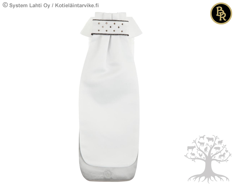 BR Stock Tie Modena. Pleated stock tie made of high-quality shiny polyester satin. The centre of the stock tie is embellished with dark imitation diamonds and a glittering trim. The bottom of the stock tie features an embroidered silver BR logo. The stock tie is double-folded and interfaced in shiny silver satin for an extra luxurious look. The stock tie is extremely practical to use, is ready tied and does not need a stock pin. The stock tie can easily be fastened around the collar of the competition shirt or blouse by means of the Velcro closure at the back.