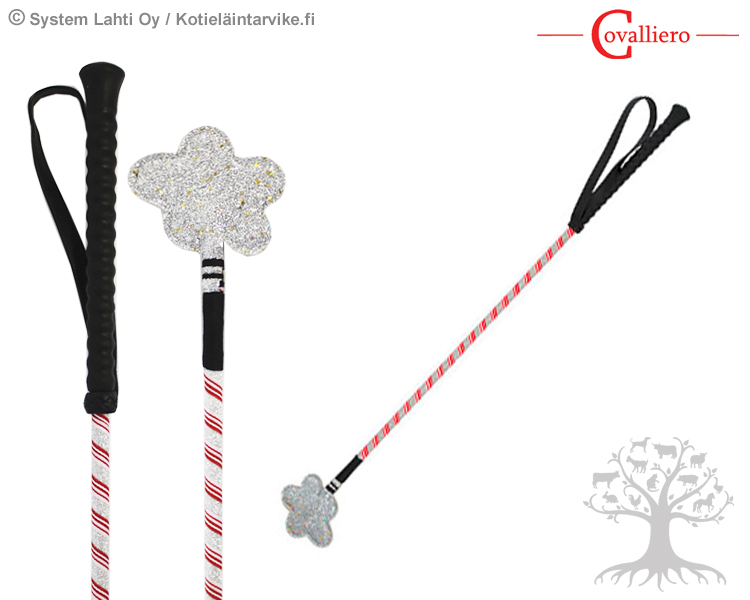 Covalliero Yleisraippa Glitter Whip. Hauska kukanmuotoisella "glitteri -läpsyllä" ja käsilenkillä varustettu yleisraippa, jossa on pitävä PVC -muovinen kädensija. Raippa on valmistettu lasikuidusta, joka on päällystetty kestävällä nailonilla.