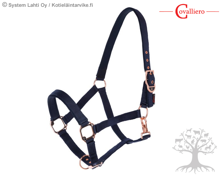 Covalliero Riimu Classy Navy. Laadukas, kestävä ja säädettävä nailonriimu, jossa on turvalla ja niskassa pehmeät neopreenipehmusteet. Riimun niska- ja leukahihnassa on hyvät säätömahdollisuudet, lisäksi säätörei'issä on metallivahvikkeet. Riimussa ruusukullanväriset metallisoljet, poskihihnassa pikalukko.