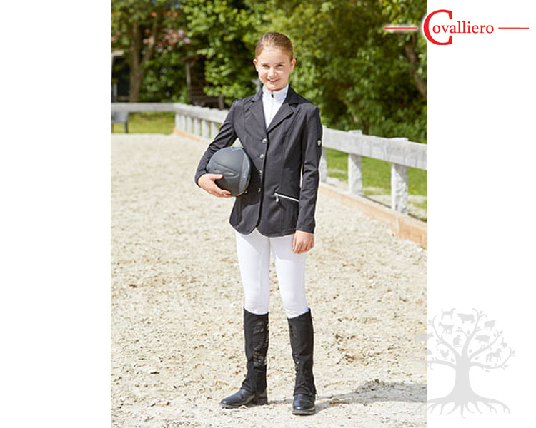 Covalliero Kisatakki Samantha Kids Black. Covallieron todella joustava ja tyylikäs lasten kisatakki. Erittäin joustava ja laadukas kangas takaa hyvän liikkumavapauden. Takki on hengittävää sekä vettähylkivää materiaalia. Edessä on nappikiinnitys sekä tyylikkään yksityiskohdan tekevät kaksi hopeisen väristä vetoketjullista taskua. Takana on kaksi halkiota, joihin brodeerattu kiiltävällä hopeisen värisellä langalla Covalliero-logo. Normaalia lasten mitoitusta. Todella tyylikäs kisatakki!