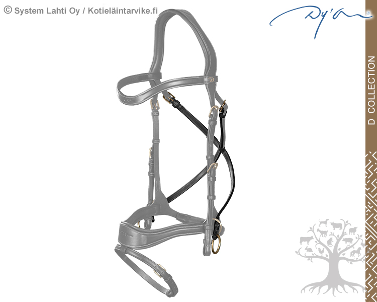 The hallmark of this collection is its beauty: All D Collection items are finished with cream-coloured thread and brass buckles. Premium D Collection is made of Dy’on leather. The Dy’on leather is produced by vegetable tanning, and it stands out for the beauty and fine finishing of its leather. Everything in collection is interchangeable. That enables you to create your own bridle by selecting the accessories of your choice. Almost all the components of a given collection can thus be combined. That offers you a vast range of options. D Collection are particularly complete. It includes bridles, reins, breastplates, and a large assortment of accessories and nosebands. D Collection exceptional style makes this Dy’on’s most popular collection. Its elegance and fine details never fail to make an impression!