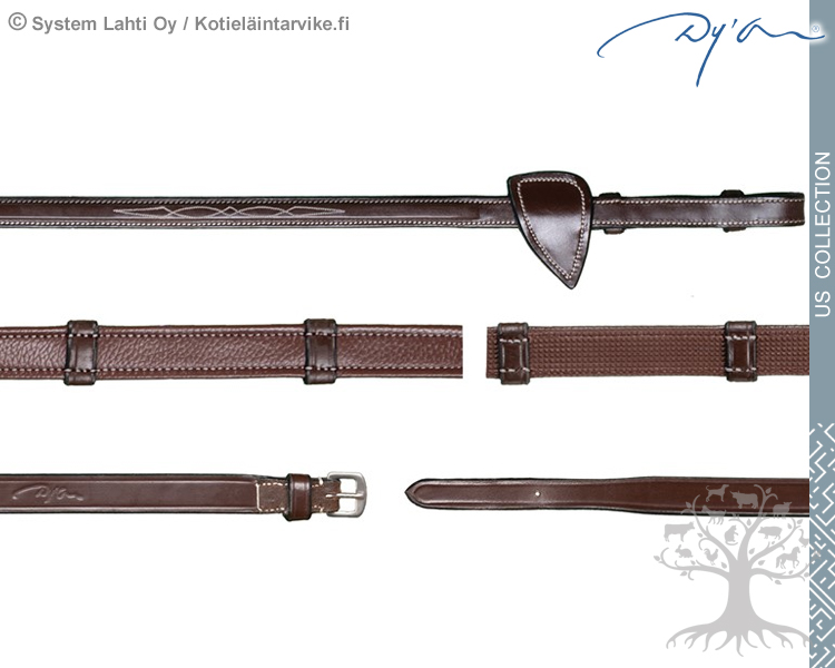 Dyon US Collection Ohjat Hunter 5/8" with 7 Leather Loops. Dyonin erittäin korkealaatuiset nahka-kumiohjat, joissa on hienot kantikkaat ”kohokanttaukset”, kermanväriset tikkaukset ja ruostumattomat terässoljet. US Collection on valmistettu erittäin hienosta ja pehmeästä Dy’on -nahasta. Ohjasosan toinen puoli on pehmeää nahkaa ja toinen puoli ohutta kumigrip-pintaa. Kumigripin nystyrät ja nahkastopparit (7 leather loops) auttavat saamaan pitävän otteen. Ohjien leveys 5/8", 16mm. Ohjissa on tyylikkäät Flash -koristeompeleet ja D -malliset martingaalistopparit. Ohjien piilosoljet tekevät suitsista huolitellun näköiset. Sopii kaikkiin Dyon US Collection suitsimalleihin.