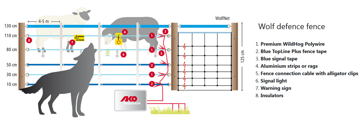 The electric fence must be optimally earthed – whether that’s a fence equipped with five wires or the AKO WolfNet. A powerful 12 V AKO fence device with a fence voltage of around 4000 to 5000 volts and an impulse energy of around 5 Joules is used to provide power. The ground clearance of the lowest blue AKO TopLine Plus fence tape should be 10 to a maximum of 20 cm. When using the AKO WolfNet, this must reach to the ground (take uneven terrain into account!). Only then can it protect against undermining. Wolves will first try to push themselves under a fence instead of jumping over it. The additional AKO wires (or tapes) are affixed at 30 and 50 cm height on the classic electric fence. The spacing can then be a little larger – e.g. wires at 80 and 110 cm in height.