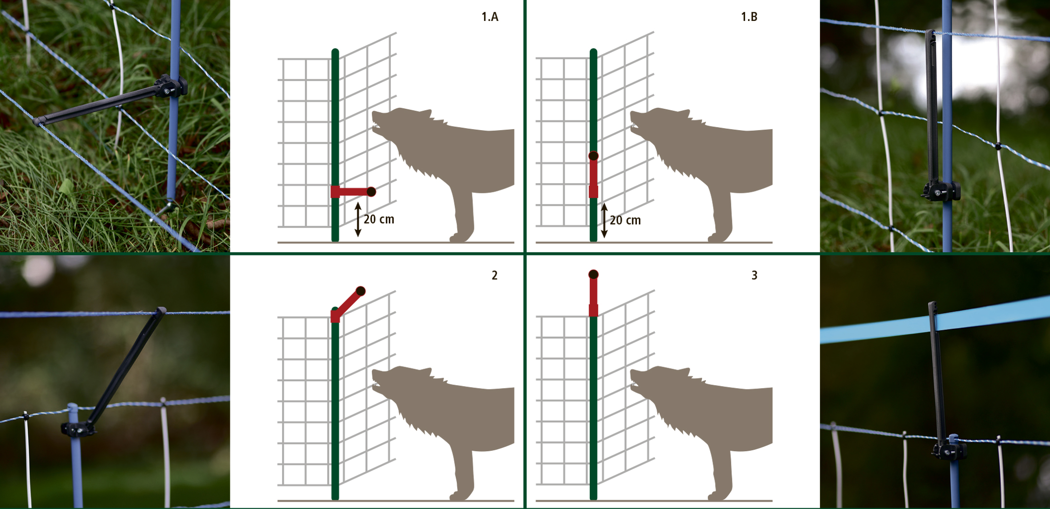 The topic of effective herd protection to ward off wolves is getting more presence and attention every day, the pressure is growing: AKO has developed the optimal supplementary set for your mobile pasture fence, for your sheep net here! With the WolfStop, a pasture net can be extended by an additional physical barrier and electrified. The extension set is a very easy-to-install system consisting of a holding rod with connection clamp that can be attached or retrofitted to net posts. The connection clamp can be installed and removed from any net post. The angle of the pole to the net post can be set and locked at 3 defined angles (90°, 45° or parallel to the post).