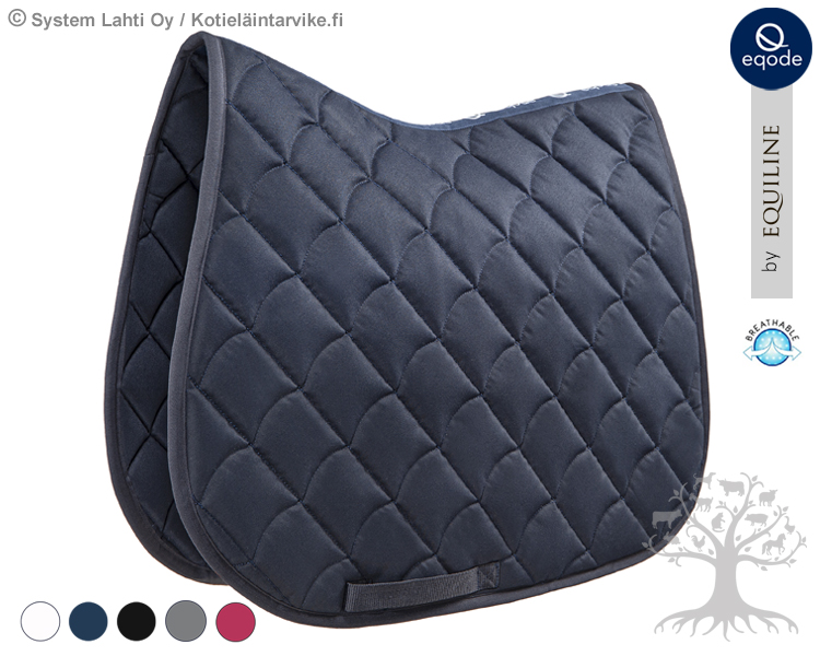 Eqode by Equiline Saddle Pad Team. The stylish and timeless, shaped saddle pad from the Eqode by Equiline collection, available as a jumping and dressage models. The saddle pad has a Shock Absorber feature, which guarantees excellent breathability, shock absorption and pressure distribution. The Saddle pad has a large checkered stitching and a Eqode-logo top ribbon. The Eqode saddle pad is made of polyester and cotton, making it easy to care for, breathable and quick-drying. We recommend!