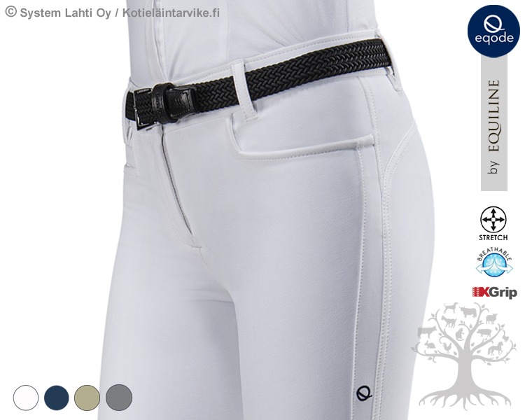 Eqode by Equiline Women's Riding Breeches Knee Grip. High-quality and comfortable Knee Grip riding breeches from the Eqode by Equiline collection. The technical features of the riding breeches are particularly evident in the cuts, shapes, materials and, above all, the quality of the breeches. The breeches use the wonderfully soft, breathable and 4-way stretch HeiQ Smart Temp fabric. The Q-patterned X-Grip silicone on the breeches give the rider optimal good grip. There are two pockets on the front and an embroidered eqode Q logo on the other leg and showy eqode logos on the lycra resors. Waist height is normal. The Riding breeches have a great fitting in the Equiline style, which makes the trousers fit well and feel very comfortable. We recommend!