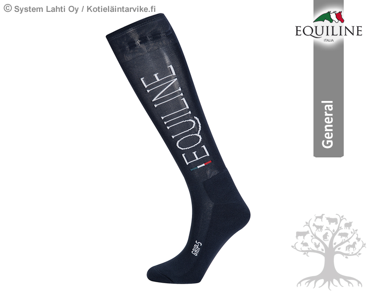Equiline General Saapassukka Easy Fit with Grip. Equilinen erittäin laadukas ja tekninen polvipituinen saapassukka. Sukat ovat hengittävät eivätkä hiosta, pohkeen sisäpuoli on ohutta verkkomaista kangasta. Saapassukan ylävarsien sisäpuoliset Grip -printit (silikoni) ja joustoresorit pitävät sukat erittäin hyvin paikoillaan. Sukassa varpaat, jalkapohja sekä kantapää ovat kevyesti pehmustetut. Erinomainen istuvuus, sukat on muotoiltu molemmille jaloille erikseen. Sukan varressa tyylikäs Equiline-logo. Valmistettu Italiassa.