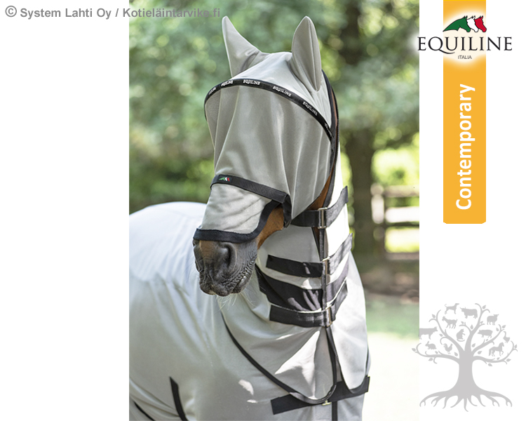 Equiline Kärpäshuppu Lemonmask Aluminum. Erittäin laadukas ja anatomisesti muotoiltu kärpäshuppu, joka suojaa hevosta kaikinlaisilta hyönteisiltä. Kärpäshupun vanne ja tiheä verkkokangas pitää hupun hyvin muodossaan ja tukevasti paikoillaan. Hupun sisällä oleva vanne estää huppua laskeutumasta hevosen silmille, joten se sopii erityisesti herkille hevosille. Hupussa on pehmeä verkkokangas ja fleecellä pehmustetut reunat sekä sisäsaumat, mikä ehkäisee hiertymien syntymistä. Kärpäshupussa on hieman auringonvaloa pois heijastava pinta.