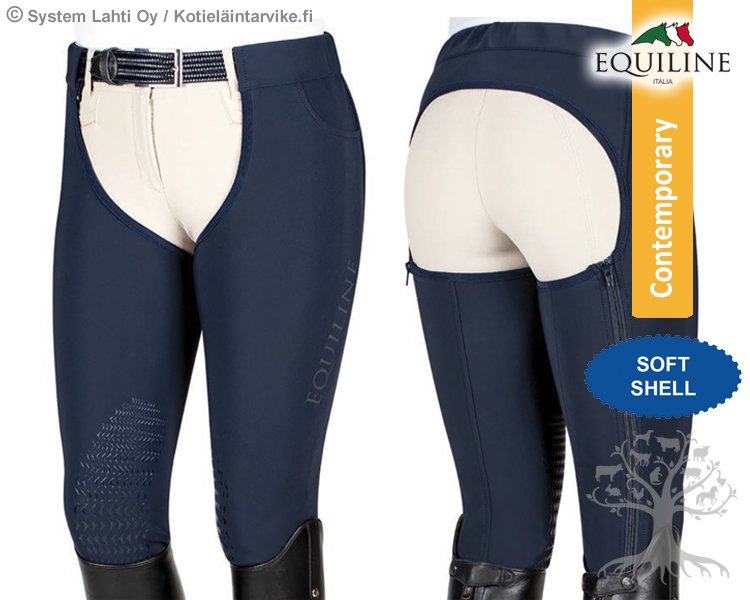 Lahkeen ulkosivuilla on laadukkaat ja kestävät YKK -vetoketjut, jotka kuvasta poiketen vedetään kiinni ylhäältä alaspäin (vetoketjun vedin jää lahkeen alaosaan). Kokochapsit kiinnitetään vyötäröltä vyön avulla (ei sisällä erillistä vyötä). Kokochapsien Knee X-Grip -polvipaikat ovat optimaalisen pitävää (ei liian pitävää) ja laadukasta silikonia. Equilinen supersuosittuja Softshell -kokochapsejä käytetään syksy-, talvi- ja kevätaikaan, sekä kylminä kesäpäivinä! Kokochapsit on myös kätevä tapa suojata esimerkiksi valkoisia kisahousuja ennen varsinaista kilpailusuoritusta.