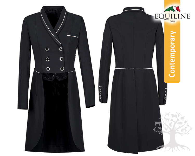 Equiline Limited Naisten Kisafrakki Crystal. Equilinen huippulaadukas ja elegantti tekninen naisten kisafrakki, joka on huippuunsa suunniteltu ja valmistettu urheiluvaate. Frakin tekniset ominaisuudet tulevat esiin erityisesti takin leikkauksissa, muodoissa, materiaaleissa ja ennen kaikkea korkeassa laadussa. Frakki on valmistettu erittäin hengittävästä ja vettä sekä likaa hylkivästä X-COOL EVO-kankaasta, joka on erittäin joustavaa, kevyttä, miellyttävän tuntuista sekä ergonominen antaen erinomaisen liikkumavapauden. Helppo hoitoinen ja nopeasti kuivuva. Takissa on erityisen kauniit ja tyylikkäät valkoiset koristenauhat sekä liepeissä alcantara -kangas mustilla koristekristalleilla. Takissa erittäin kauniit ja tyylikkäät napit. Takin hännyspainot pitää hännykset kauniisti paikoillaan. Kisafrakki on suunniteltu ja valmistettu Italiassa.