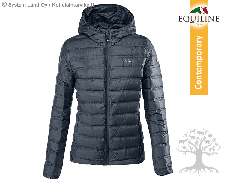Equiline Limited Naisten Untuvatakki Zaffiro. Equilinen erittäin tyylikäs naisten untuvatakki, joka on ihanan kevyt, pehmeä ja lämmin. Edessä on kaksi vetoketjullista taskua ja takin sisäpuolella kaksi povitaskua. Takissa on huppu ja korkea kaulaa lämmittävä kaulus. Rinnassa Equiline-brodeeraus. Takissa on käyetty Equilinen innovatiivista down and feather systeemiä, jonka vuoksi takissa on korkein mahdollinen lämpö! Untuvatakissa on käytetty perinteisen vuoritikkauksien sijaan painomenetelmää, jonka avulla untuvat pysyvät paremmin paikoillaan. Takin hiha- ja helmaresori on sijoitettu takin vuori/sisäpuolelle, joka tekee takkiin viimeistellyn ja tyylikkään ulkonäön.