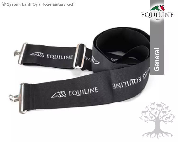 Equiline Loimivyö Zane. Erittäin laadukas ja tyylikäs joustava musta loimivyö, jonka pituutta voidaan portaattomasti säätää metallisolkien avulla. Kaunis kaksivärinen vyö, mustalla pohjalla valkoiset Equiline-logot. Loimivyön leveys noin 8cm. One size, yksi koko.