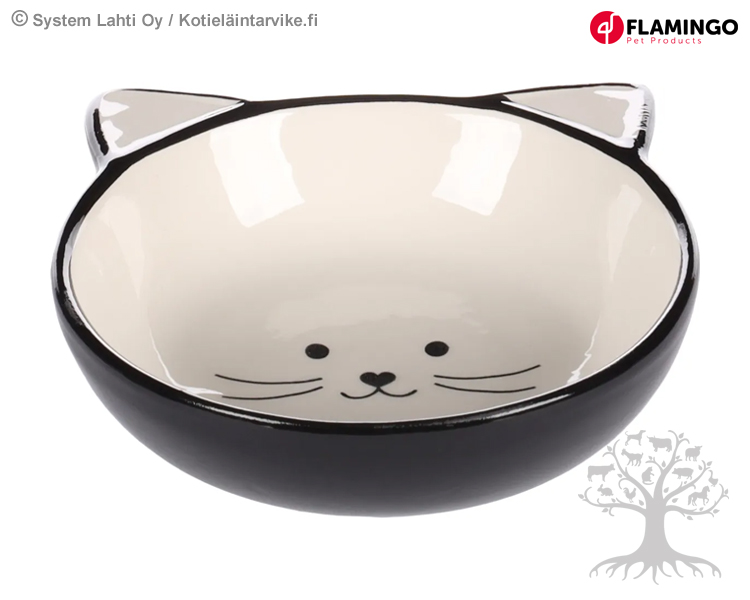 Flamingo Ceramic Cup Kajo 0.28L. Cute, durable and glazed Falmingo ceramic cup for cats. The heavy ceramic cup stays in place well. Easy to clean. There is a cute cat face on the bottom of the cup. The inner surface of the cup is white and the outer surface is black. Dishwasher safe.