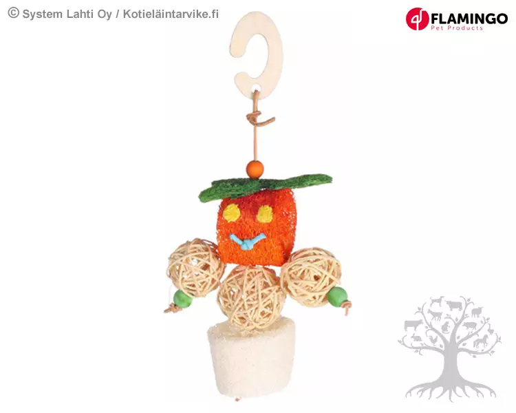 Flamingo Jyrsijän Lelu Hasam. Pureskeluun ja leikkiin kaneille, marsuille ja pienille jyrsijöille. Valmistettu pesusienistä, rottinkista, puusta ja nahasta. Valmistuksessa käytetty ainoastaan turvallisia materiaaleja ja väriaineita, joten ne ovat turvallisia pureskeltaviksi sekä pitämään jyrsijän hampaat kunnossa. Puisen koukun avulla voit ripustaa lelun minne tahansa.