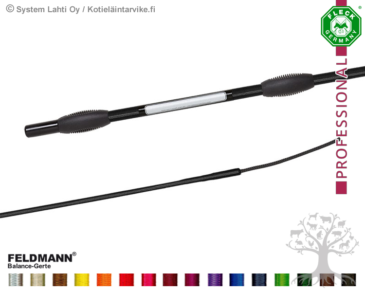 Fleck Kouluraippa Feldmann Balance Sport with Name Tag. Fleck Professional Feldmann Perfect Balance Sport -malliston erittäin laadukas ja suosittu kouluraippa, jossa on pehmeät ja erityisen pitävät SoftRubber -kädensijat sekä kätevä nimilappu (name tag). Nimilapun ansiosta raippasi on helposti tunnistettavissa, kirjoita nimesi vedenkestävällä tusilla. Feldmann Perfect Balance Sport- kouluraipassa on kahdella kumipintaisella "tasapainohelmellä" tasapainotettu kädensijat. Tasapainohelmien kumipinta on viimeistelty liukuestekuviolla, mikä tekee niistä erittäin pitävät ja mukavan tuntuiset. Otetta ja käden paikkaa vaihtelemalla myös raipan tasapainopiste ja näin ollen myös käyttötarkoitus vaihtelee. Soveltuu myös maastakäsittelyyn. Tasapainotuksen ansiosta raippa on "tarkka" käytössä ja tuntuu todella kevyeltä.