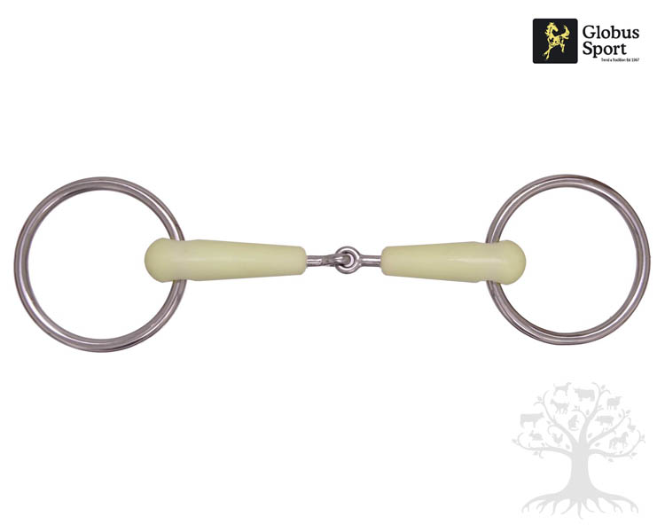 Globus Loose Ring Snaffle Sorbit. Snaffle Sorbit on nivelkuolain, jonka suuosa on päällystetty omenanmakuisella synteettisellä muovilla. Nivelkuolain sopii hieman etupainoisille ja edestä raskasrakenteisille sekä päätään alaspäin painaville hevosille. Nivelkuolain on vaikutuksiltaan vahvempi kuin yleensä luullaan.Valmistettu ruostumattomasta teräksestä ja synteettisestä (kovasta) muovista. Kuolaimen omenanmaku stimuloi hevosen syljen ja liman eritystä toimien ns. "voiteluaineena". Kuolaimen paksuus 18mm. Kuolainrenkaan halkaisija on 50mm koossa 105-125mm ja 70mm koossa 135-145mm. Synteettisestä muovista valmistetut kuolaimet eivät kestä puremista. Älä käytä kuolainta, jonka pinta on jo vaurioitunut!