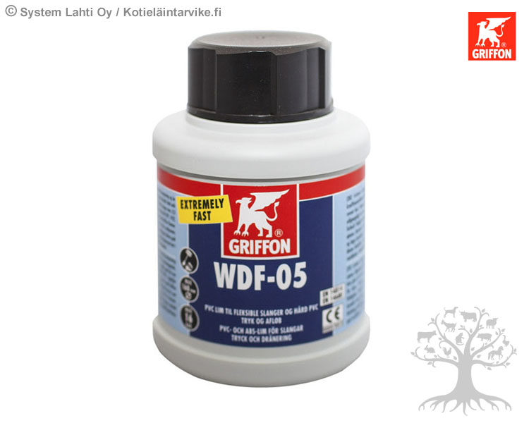 Griffon PVC Glue WDF-05 250ml. Extremely fast, thixotropic, blue PVC cement. Suitable for joining pipes, sockets and fittings with interference fit and loose fit (gap filling) in pressure and drainage systems. Extremely suitable for flexible hoses and applications under wet conditions, such as swimming pools. With special pipe brush for quick and easy application. Suitable for diameters up to 160 mm and max. 16 bar pressure. Maximal tolerances 0.8mm diametrical clearance and 0.2 mm press fit. Do not use in temperatures under +5°C.