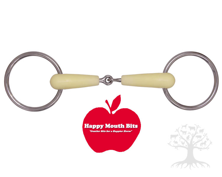 Happy Mouth Loose Ring Snaffle Apple. Snaffle Apple on nivelkuolain, jonka suuosa on päällystetty omenanmakuisella synteettisellä muovilla. Nivelkuolain sopii hieman etupainoisille ja edestä raskasrakenteisille sekä päätään alaspäin painaville hevosille. Nivelkuolain on vaikutuksiltaan vahvempi kuin yleensä luullaan.Valmistettu ruostumattomasta teräksestä ja synteettisestä (kovasta) muovista. Kuolaimen omenanmaku stimuloi hevosen syljen ja liman eritystä toimien ns. "voiteluaineena". Synteettisestä muovista valmistetut kuolaimet eivät kestä puremista. Älä käytä kuolainta, jonka pinta on jo vaurioitunut!