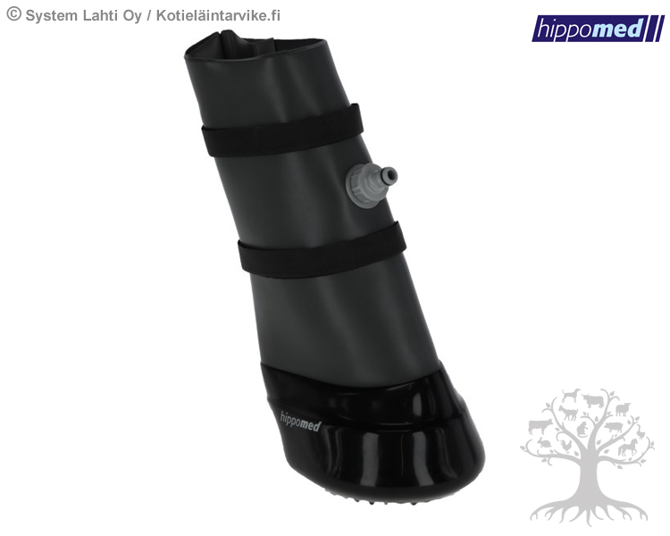 Hippomed Cooling & Therapy Hoof Boot. With the patented Cool Boot you can cool the leg or the hoof of a horse in the best possible way. You simply pull the boot over the hoof up the leg and connect it to the water hose. The water flows through a system of several jets of water along the horses leg and cools it slowly and regularly. The water consumption is very low. In the sole area there are holes which allows the water to drain and no waterlogging can arise. Alternatively you can put in a pad to keep the water from draining for therapeutic purposes.