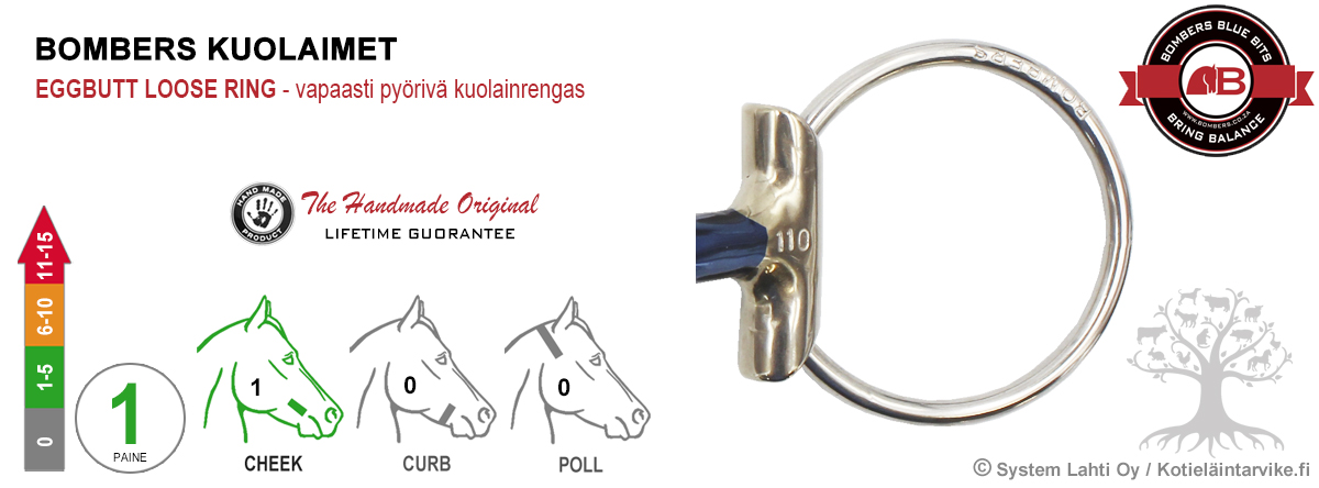 CHEEKPIECE - Eggbutt Loose Ring - The Eggbutt Loose Ring prevents pinching of the lips and gives a more solid feel against the side of the face. It also prevents the bit being pulled through the mouth. The Loose Ring allows quick release and no poll pressure. A fixed cheek piece is designed to sit closely to the horses lips, it encourages flexion. The cheekpiece ring size is about Ø67mm for bit width 90-115mm and about Ø78mm for bit width 120-160mm.