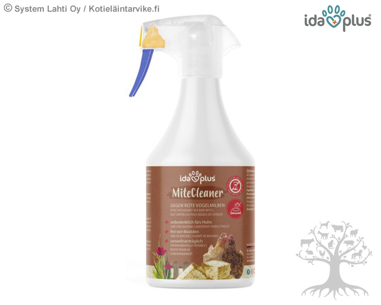 IdaPlus MiteCleaner 500ml. MiteCleaner markedly restricts mites' freedom of movement. The specially designed, non-toxic spray solution makes use of the physical properties of hydrophobic lipids, preventing the red poultry mite from settling in. Immediate effect without waiting. Harmless to chickens. Developed with biologists. Physical mode of action, not a biocide. Environmentally compatible.