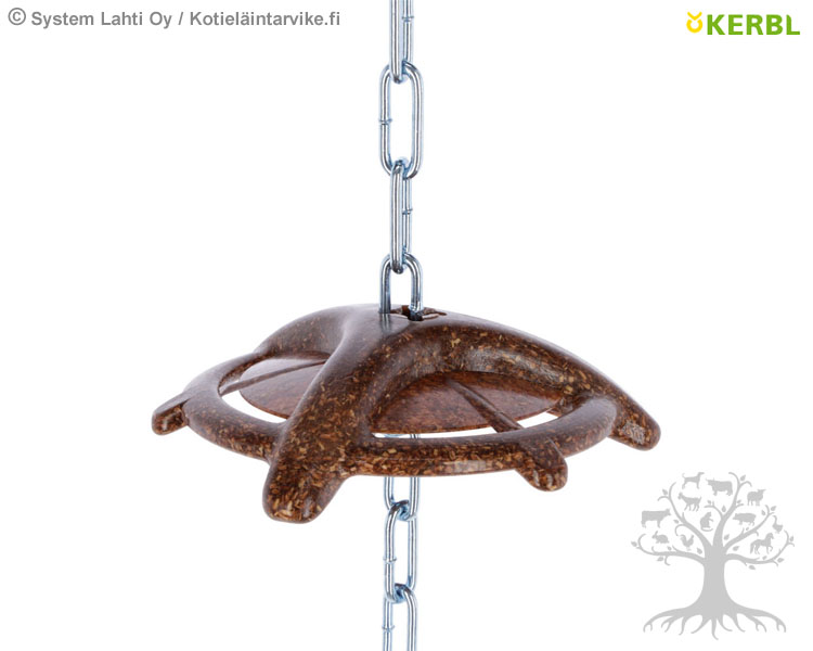 Kerbl Biting Ring Nature with Hanging Chain. Biting ring for the reduction of aggression in the stable. Biting ring has calming and distracting effect. Made from food-grade, naturally renewable raw materials. Made from polylactic acid derived from sugar cane, reinforced with wood fibres. With hanging chain 75cm. Hanging chain is galvanised metal. Suitable for piglets up to max. 25 kg. Color: nature. Diameter 18cm. GM-free. Biodegradable.