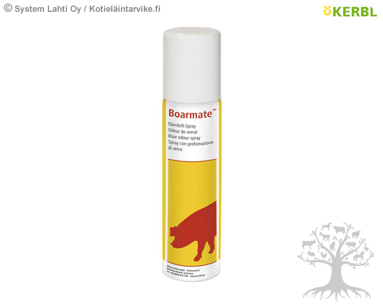 Kerbl Boar Spray Boarmate 250ml. Boarmate is an aerosol containing synthetically produced ‚boar odour‘ (5α-androst-16-en-3-one). This compound has an odour identical to that produced by the boar‘s submaxillary glands; the same odour that a sow reacts to by standing -reflex when she is ready for mating. Boarmate was developed as an aid to farmers and growers to overcome difficulties that arise in identifying sows and gilts that are ready for insemination. Paking size: 250ml.