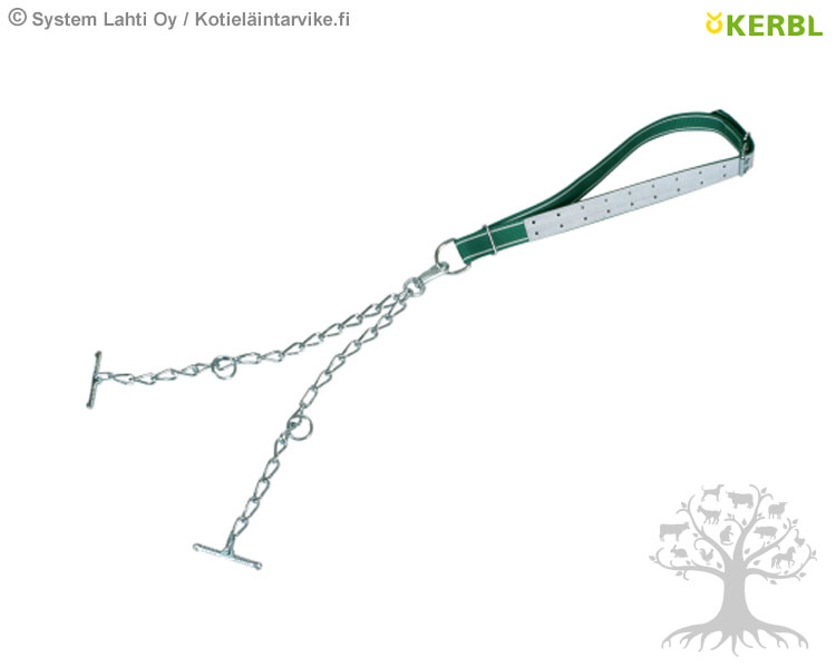 Kerbl Cattle Tethering with Collar 150x5.5cm, Bulls. Adjustable neck strap for bulls with roller buckle. Double buckle improves tensile strength. The length is 150cm and the width is 5cm. Color: Green/white. The strap is made of nylon with leather reinforcement. Oval link and D-ring for attachment. Chain component double with snap-hook and toggle. Length is 2x77cm and link thickness is 6mm. All chain components galvanic zinc-plated.