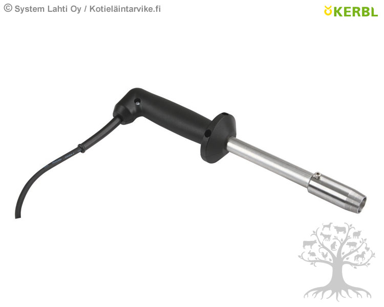 Kerbl Dehorner. Mains-operated Dehorner. Max temperature is 620 °C. The Dehorner has an ergonomically shaped handle. Dehorner is very light, so it is easy to handle. The Burning rod is made of stainless steel and is about 15.5 cm long. The total length of the dehorner is 30 cm. Includes stainless steel tip Ø18 mm. Cable length is 3m. The Dehorner is ready for use in 11 minutes. Mains connection 230V, and power 210W. Made in Germany.