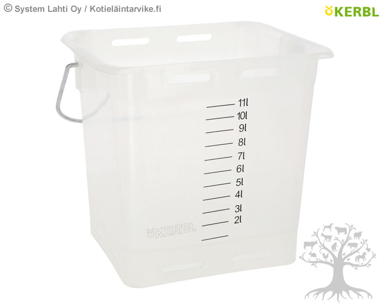 Kerbl Feeding Bucket 13L transparent. The filling level is easy to see from the transparent feeding bucket. Printed scale on the back and embossed scale on the inside. With metal handle. Acid-resistant and food-safe. Easy to clean. Convenient hanging holes in the bottom. The bucket is easy to hang to dry after washing. The sloping base helps to completely empty the bucket. Hygienic Valve, FixClip Valve and a traditional valve (for calf and lamb teats) are suitable for this feeding bucket. Design the perfect Feeding bucket! Valves and teats are available separately. Made in Germany.