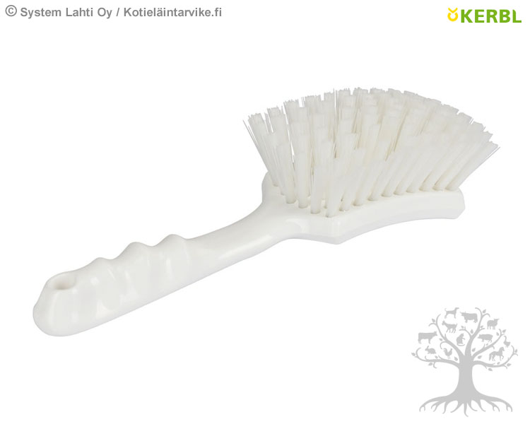 Kerbl Handle Brush 14cm. White polyester bristles. Ergonomically shaped plastic handle. Withstands heat up to 140 °C. Length 25cm. Suitable for hygienic areas (HACCP).