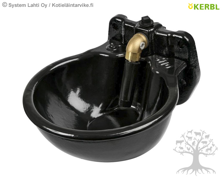 Kerbl Heatable Water Bowl H10. Drinking bowl made of gray cast iron and surface is enamelled. Water flow rate can be regulated on the pipe valve. New heating concept with valve heating to keep clear of frost. Easy to install. Suitable for circulating heating systems. Frost-protected down to approx. -20 °C. For wall and pipe mounting. Heating output 80W. Voltage 24V. Water connection G1/2" from above or below. Dimensions (W x D x H): 25.8 cm x 28.2 cm x 17.8 cm. Flow rate 3 bar 8 L/min. Color: Black. Drinking bowl volume: 1.6L.