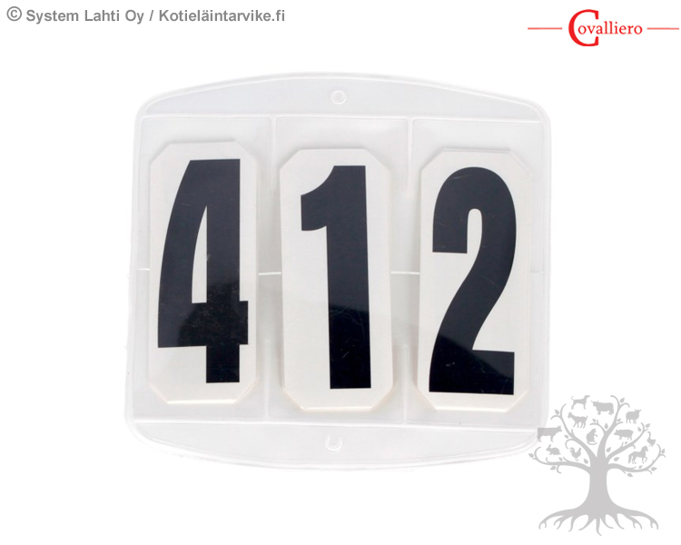 Covalliero Kisanumerolaatta 3-numeroa, Tarrakiinnitys. Kisanumerolaatta on kolme numeroinen, numerot valittavissa 000-999 väliltä. Kisanumerolaatta on valmistettu taipuisasta muovista ja se kiinnitetään pitävän tarranauhan avulla esimerkiksi hevosen satulahuopaan.
