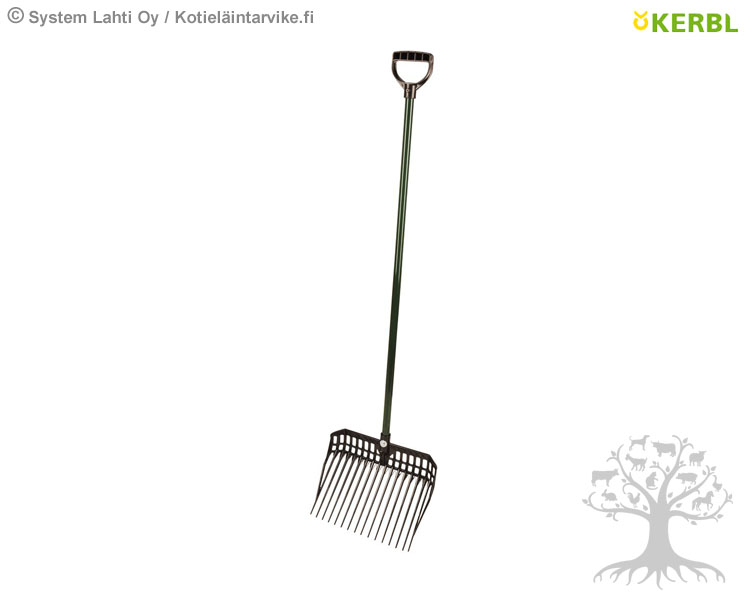 Kerbl Litter Fork with metal handle Dark Green. High-quality and durable litter fork with a metal handle. The metal handle has a plastic D-grip. The total length is 148cm. The litter fork is 38cm width and 30cm length. The length of the tines is about 23cm. Color: Dark green / black.