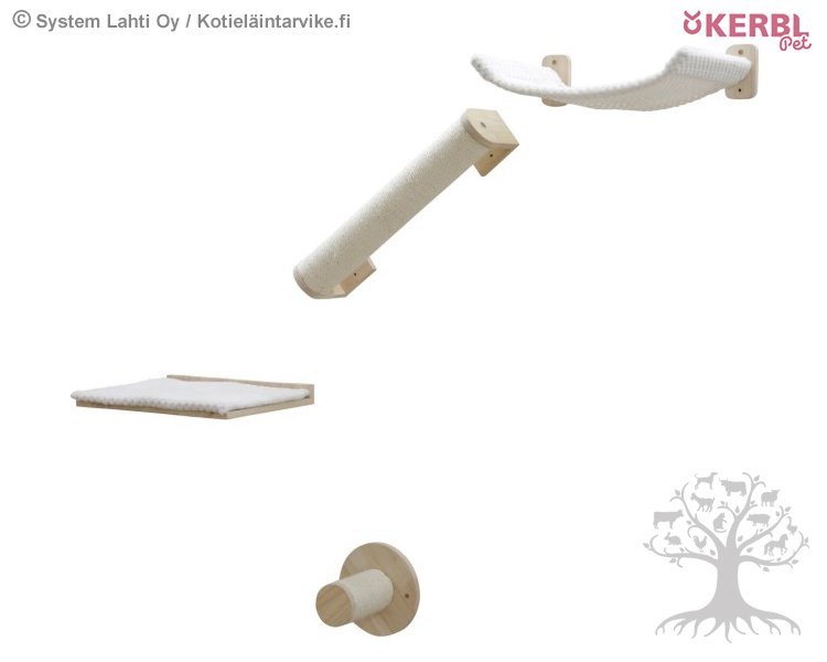 Kerbl Pet Cat Climbing Wall Alps. The 4-part climbing wall system gives your cat plenty of free space to play and spend time in peace. The Alps climbing wall system is a great choice for cramped spaces or apartments. It saves floor space and can be converted exactly the way your cat wants it. The beautiful Beige-toned ensemble is suitable for every cat house. The step and ramp are covered with a sisal rope on which your cat is allowed to sharpen its claws.
