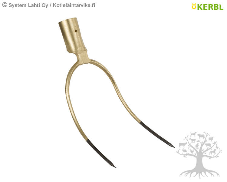 Kerbl Pitchfork 2-tines, 26x13cm. Very high quality and durable 2-tines pitchfork. Dimensions 26x13cm. Suitable handle thickness is ø 38 mm. The wooden handle 29581 and 2959 are compatible and sold separately. Made of high quality steel. Hand forged and hardened.